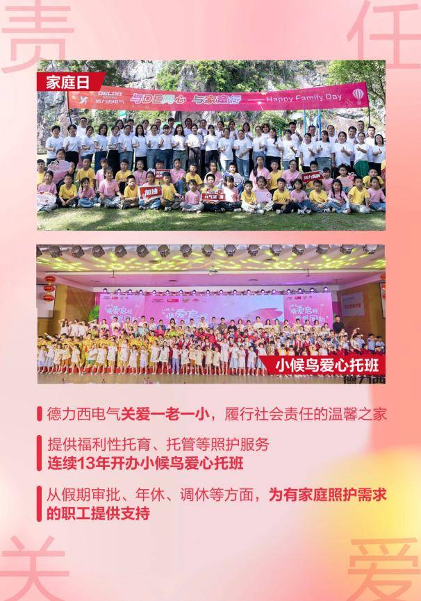 責任關愛,深化支持 德力西電氣同樣關注社會責任的履行,關愛一老一小,重視職工的照護需求,提供福利性的托育和托管服務。德力西電氣已連續(xù)13年開辦小候鳥愛心托班,惠普員工子女達到4500余人次,不僅減輕了員工的家庭負擔,而且為員工子女打造了一個“學”“教”“樂”一體的成長基地。此外,德力西電氣依法依規(guī)落實假期制度,從假期審批、年休和調休等方面支持有家庭照護需求的職工,確保他們能夠在家庭生活中承擔必要的角色,同時保持職業(yè)發(fā)展。