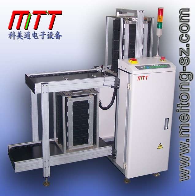 LOADER SMT自動送板機(上板機) 型號:MTT-SB-A5 深圳市美通電子設備有限公司http://www.meitong-sz.com,0755-27905052,13510163050適用:SMT和AI自動生產線送板用,無須用手接觸PCB板,更好的保護了PCB板。并可設置升降格數,本機具有升降精度高、自動進出料架、故障(音、色)報警功能,是實現全線自動化及高產量的必備設備特點: 1. 采用可編程控制器PLC控制系統。 2. LED輕觸式控制界面,操作方便。 3. 送板推出采用加長型氣缸推出PCB板,推力可調保防PCB板不被推壞。 4. 氣控采用進口中排電磁閥,使推板氣缸可以停在任意的位置。 5. 料架定位用4個氣缸分別固定料架的4點,使送板的精度更為可靠。 6. 送板出口裝有PCB保護感應器,更為有效的保護了PCB板。 7. 送板步距可分為四種(10,20,30,40mm) 8. 可放置3個料架(或者按客戶要求) 9. 方向可選取從左至右或右至左 10.標準配備信號,可與其它設備進行在線連接. 本公司所有設備均可根據客戶要求定做!