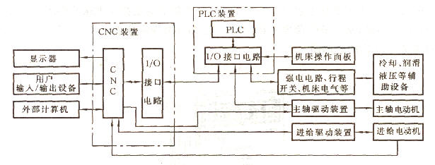 圖1 內裝型PLC的CNC系統框圖 (4)采用內裝型PLC結構,CNC系統可以具有某些高級控制功能。如梯形圖編輯和傳送功能,在CNC內部直接處理大量信息等。 世界著名的CNC系統廠家在其生產的CNC產品中,大多開發了內裝型PLC功能。 獨立型PLC又稱外裝型或通用型PLC。對數控機床而言,獨立型PLC獨立于CNC裝置,具有完備的硬件結構和軟件功能,能夠獨立完成規定的控制任務。采用獨立型PLC的數控系統框圖(如圖1所示)。  圖1 獨立型PLC的CNC系統框圖 獨立型PLC具有如下特點 (1)獨立型PLC具有CPU及其控制電路,系統程序存儲器、用戶程序存儲器、輸入/輸出接口電路、與編程器等外部設備通信的接口和電源等基本功能結構(如圖2所示)。