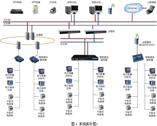該電能管理系統(tǒng)采用分層分布式計算機網(wǎng)絡結構,即站控管理層、網(wǎng)絡通訊層和現(xiàn)場設備層組成,見圖1。