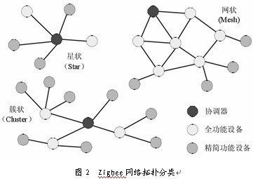Zigbee協議基于IEEE 802.15.4標準,從2004年發布Zigbee V1.0到最新的增加了Zigbee-PRO擴展指令集的Zigbee2006版本,ZIGBEE功能不斷強大。Zigbee具備強大的設備聯網功能(見圖2),它支持3種主要的自組織無線網絡類型,即星型結構(Star)、網狀結構(Mesh)和樹型結構(Cluster Tree),特別是網狀結構,具有很強的網絡健壯性和系統可靠性。與目前普遍應用的wi-Fi、Bluetooth等短距離無線通訊技術相比較,Zigbee的特點主要有: