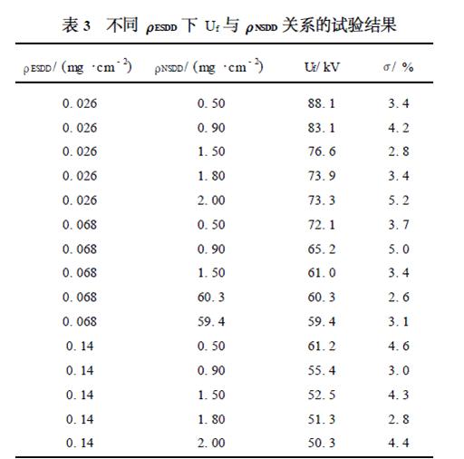 ρESDD 分別為0. 026 mg/ cm2、0. 068 mg/ cm2及0. 14 mg/ cm2 時試驗研究了XP - 160 懸式瓷絕緣子Uf ρNSDD 變化的關(guān)系, 試驗結(jié)果如表3 , 試驗得到的Uf 標(biāo)準(zhǔn)偏差在7 %之內(nèi)。對表3 的試驗結(jié)果進(jìn)行曲線擬合, 可得到同一ρESDD下Uf ρNSDD 的關(guān)系, 如圖3 所示。
